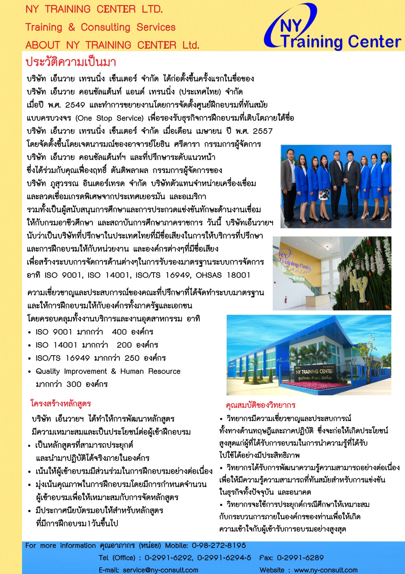 บริษัท เอ็นวาย เทรนนิ่ง เซ็นเตอร์ จำกัด ทำการดำเนินกิจการโดยสานต่อจากฐานลูกค้าเดิมของ บริษัท เอ็นวาย คอนซัลแต้นท์ แอนด์ เทรนนิ่ง (ประเทศไทย) จำกัด โดยอาจารย์โยธิน ศรีดารา ที่ปรึกษาที่มีความเชี่ยวชาญและมีชื่อเสียงระดับชั้นแนวหน้าของประเทศไทย และนายเฟื่องฤทธิ์ ตันติพลาผล กรรมการผู้จัดการบริษัท ภูสุวรรณ อินเตอร์เทรด จำกัด ตัวแทนจำหน่ายเครื่องเชื่อม และลวดเชื่อมเกรดพิเศษ รวมทั้งเป็นผู้สนับสนุนการแข่งขันทักษะให้กับหน่วยงานราชการ โดยทางบริษัทฯมีความมุ่งมั่น ในการให้บริการคำปรึกษา และฝึกอบรม ที่เกี่ยวข้องกับระบบการจัดการต่างๆ ดังนี้